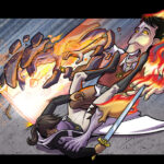 The soul well erupts in brilliant white light that blinds Danny. Within the light, we can see the image of the sword Vangel will use in the future. Vangel is reaching for the sword as The Lady unfolds her arms behind her. Vangel’s mom looks on in awe and surprise.