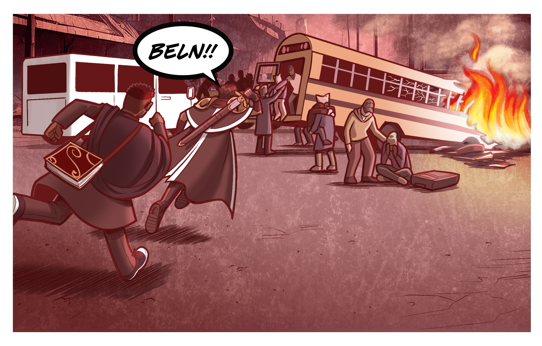 Wide shot — Vangel and Kai run toward a group of survivors gathered near a crashed, burning bus.