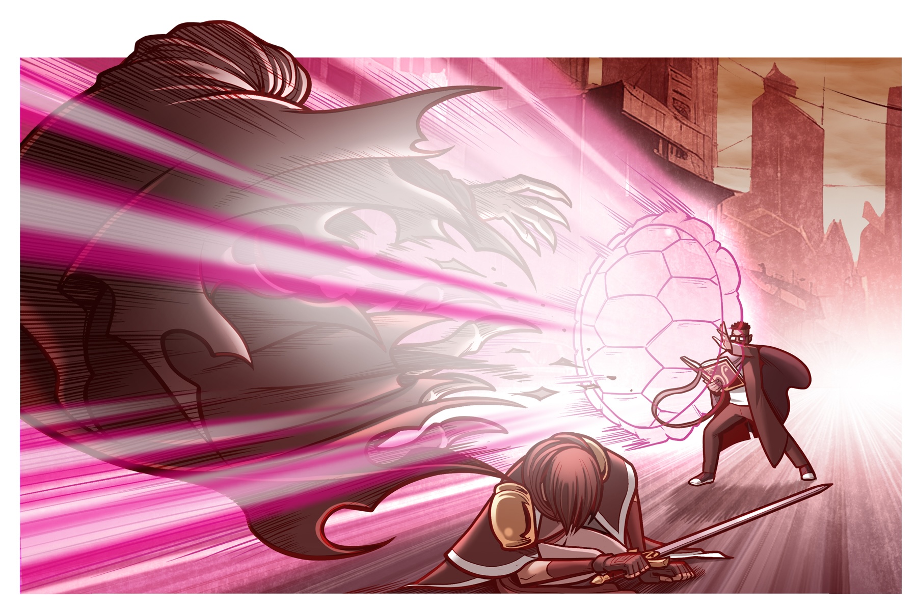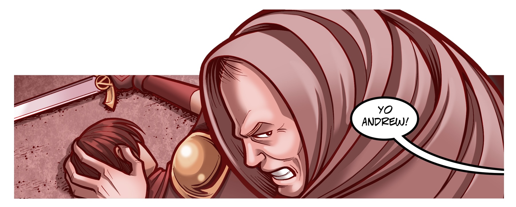 Zorn has Vangel pinned to the ground when he is distracted by a voice from behind him.
