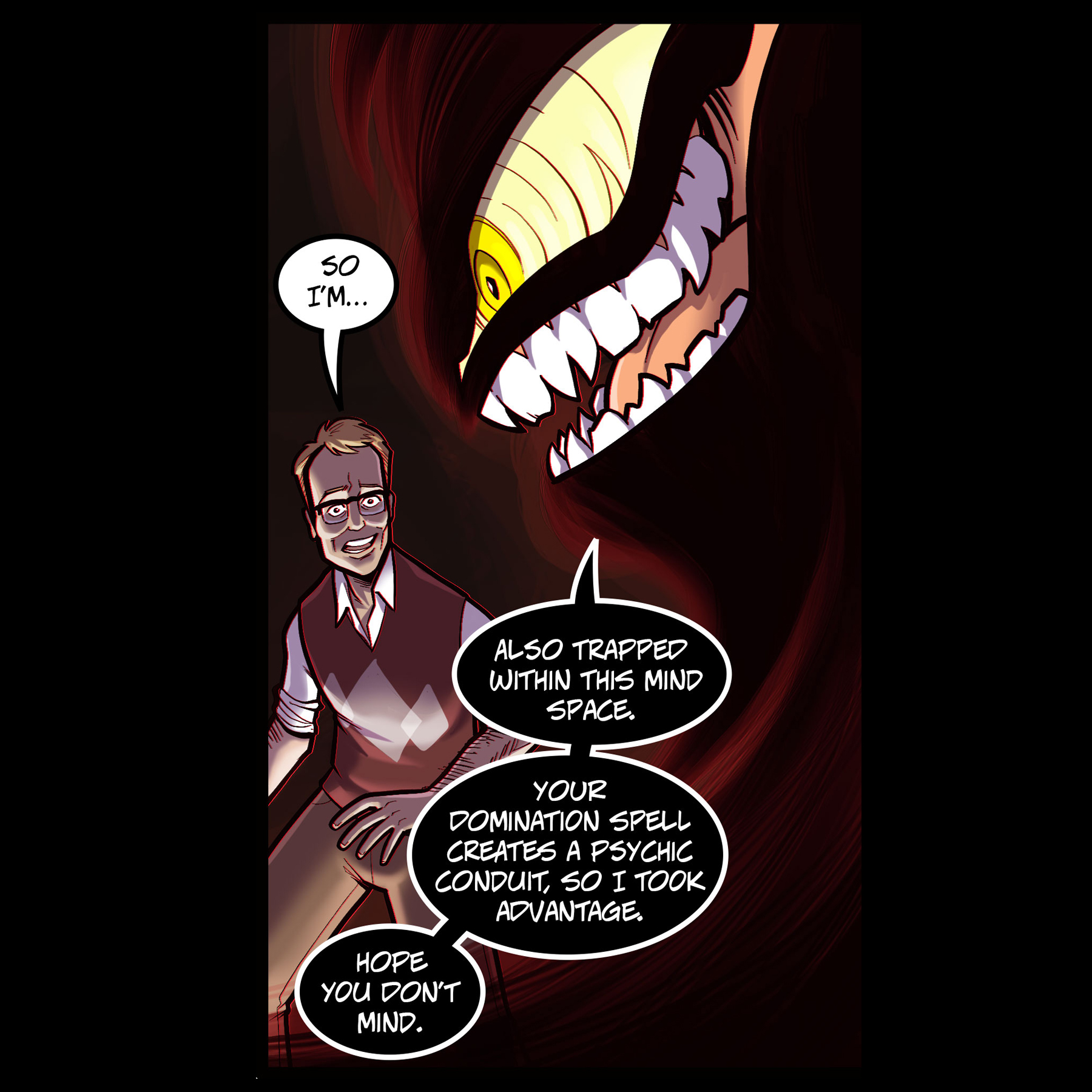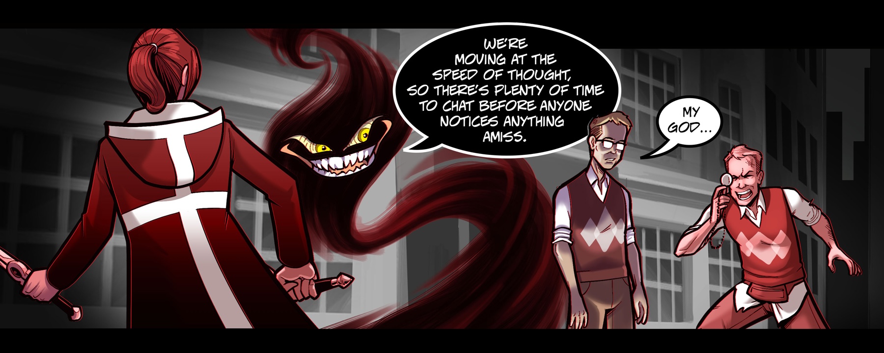 Daisy and Zorensen appear on the street where they were a moment ago. Vangel and Zorensen, mid-spell, are there frozen in time. The demon coils around the paladin’s body like a shadowy serpent.