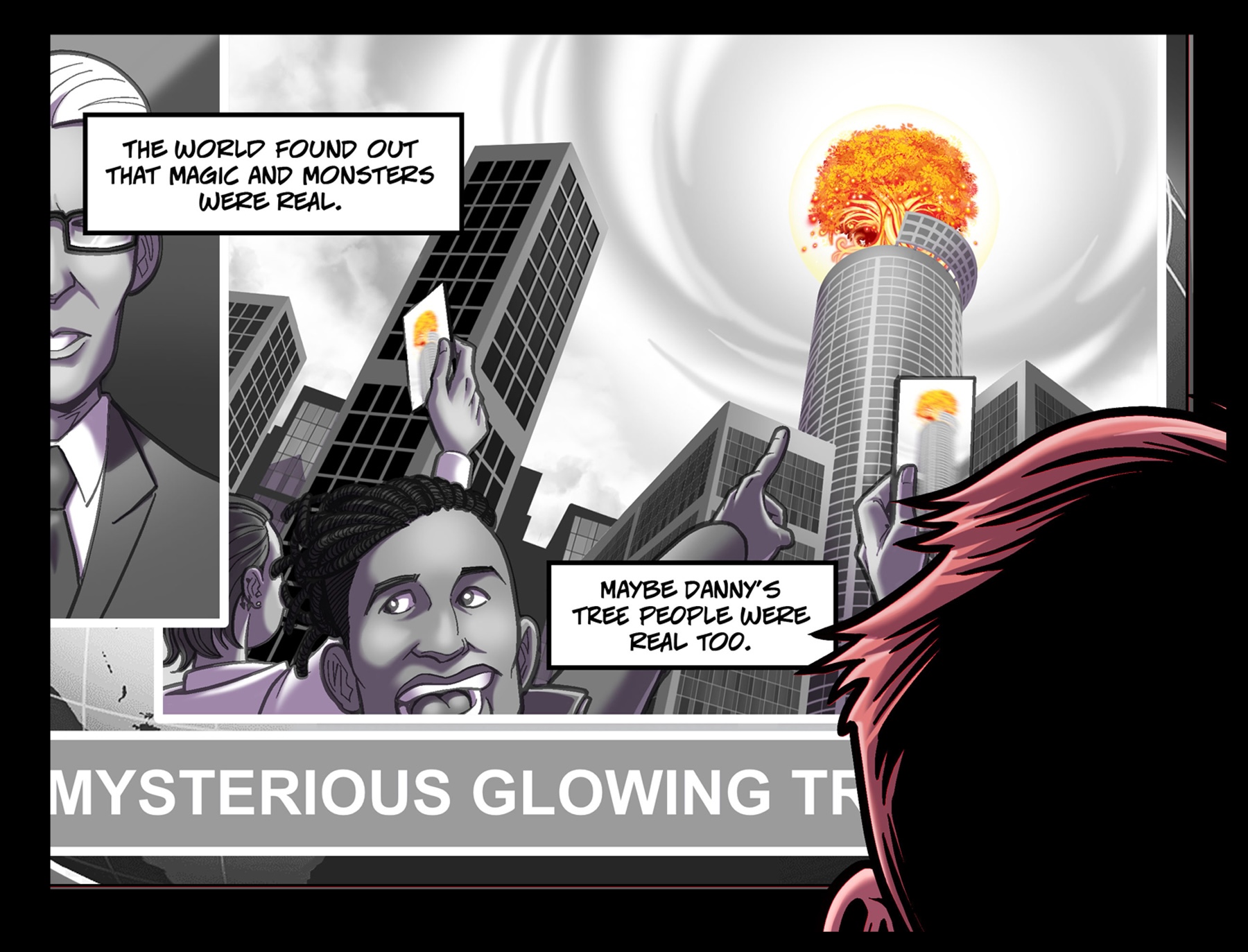 PANEL 4 – On the television is a newsfeed broadcast of The Revelation. A newscaster speaks to the audience while live footage of a crowd in panic plays next too him. Everyone is shouting, pointing, and taking phone videos of an enormous spectral tree that has appeared on top of a skyscraper.