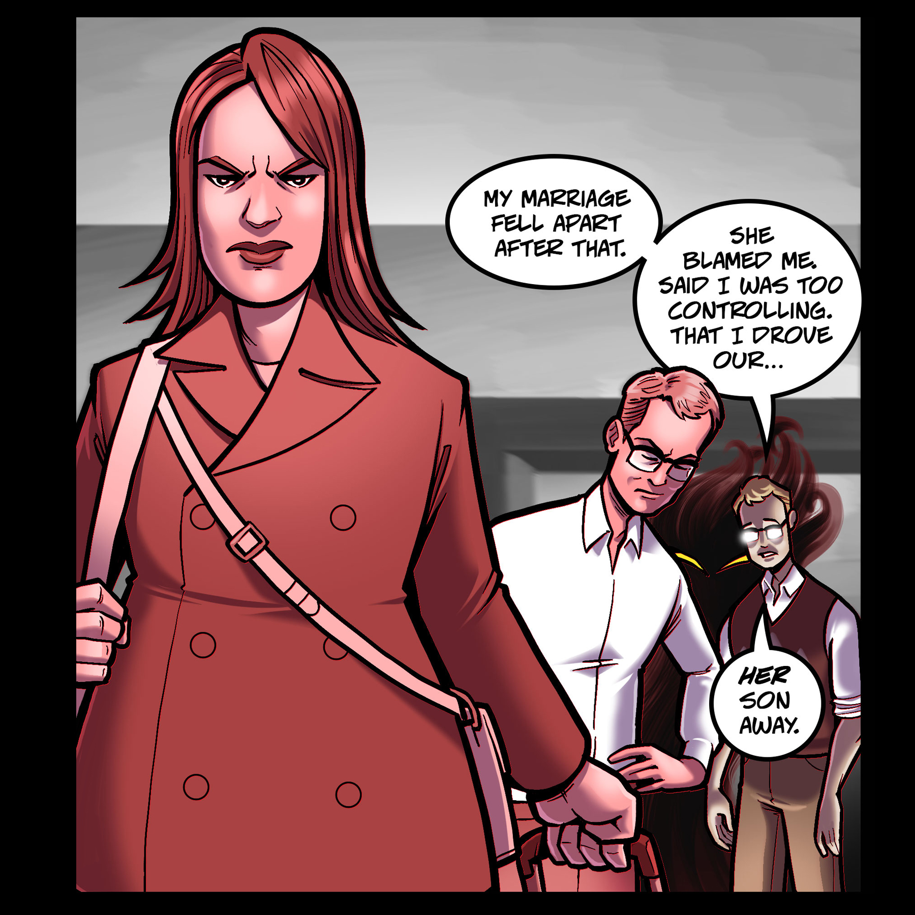 PANEL 2 – The wife leaving, suitcase in hand