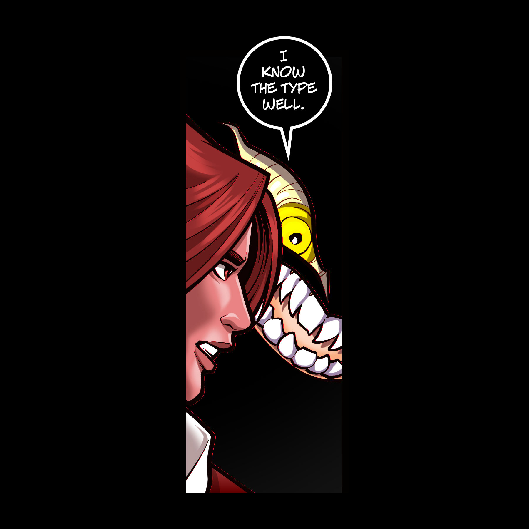 A close-up of the demon’s eyes and teeth, calm and cold as he leers fas to face with the frozen Vangel.
